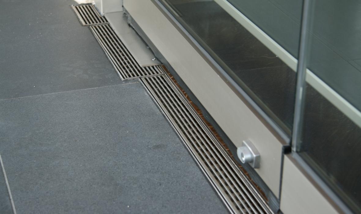 The threshold drain consists of an external linear grate which sits beside the doortrack. An integrated, concealed, sub-sill collects water and condensation around the doorway and conveys it to the external drainage system.